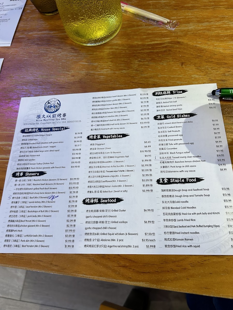 Welcome to the vibrant world of Nice Meating You BBQ, located at 535 Clarke Rd, Coquitlam. This restaurant promises an unforgettable culinary experience with its unique blend of grilled dishes and vibrant flavors. The menu features a variety of vegetarian options such as grilled eggplant and Chinese chives, ensuring there's something for everyone.